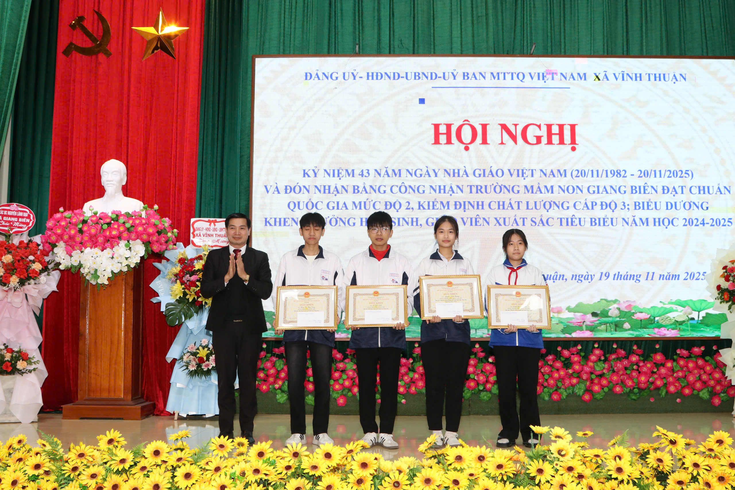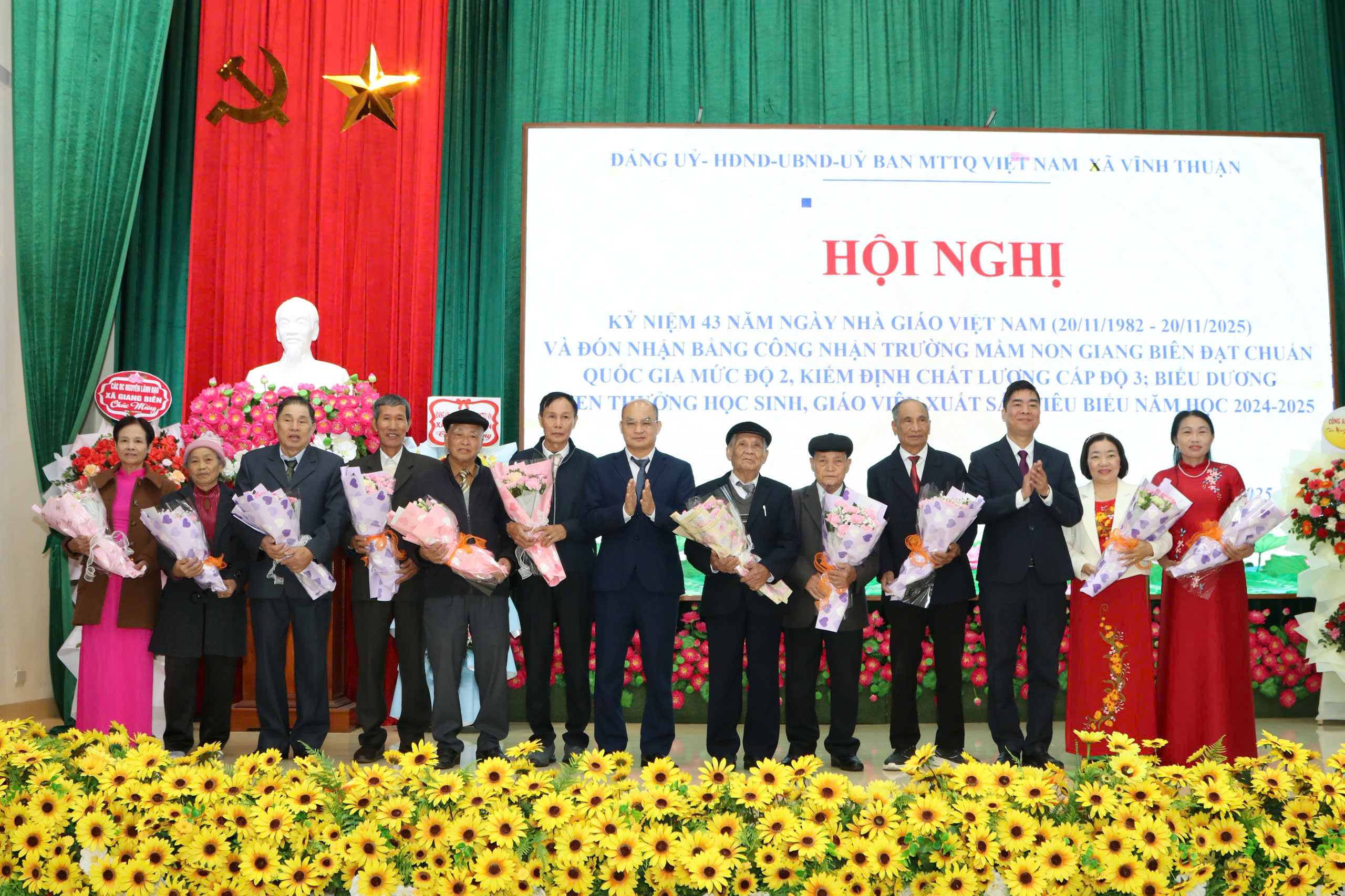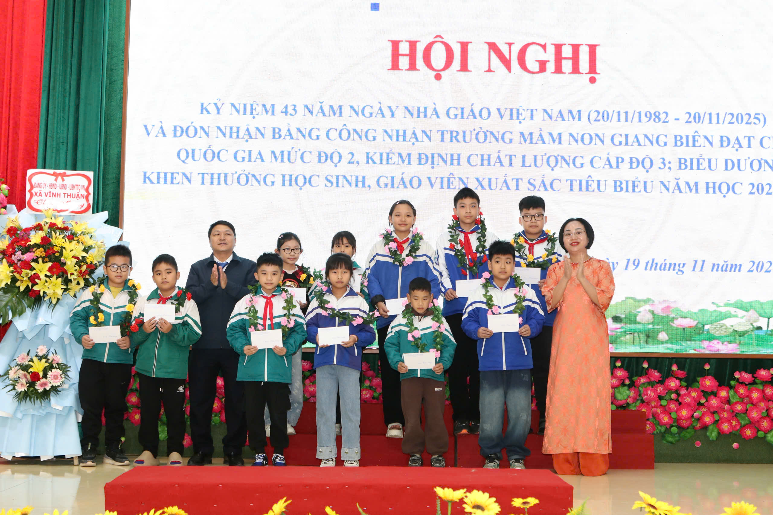 (Vinhthuan.haiphong.gov.vn) - Sáng ngày 19/11, UBND xã Vĩnh Thuận long trọng tổ chức Hội nghị kỉ niệm 43 năm Ngày Nhà giáo Việt Nam (20/11/1982 – 20/11/2025) và đón nhận Bằng công nhận Trường Mầm non Giang Biên đạt chuẩn Quốc gia mức độ 2, kiểm định chất lượng giáo dục cấp độ 3; đồng thời biểu dương giáo viên, học sinh xuất sắc năm học 2024 – 2025.