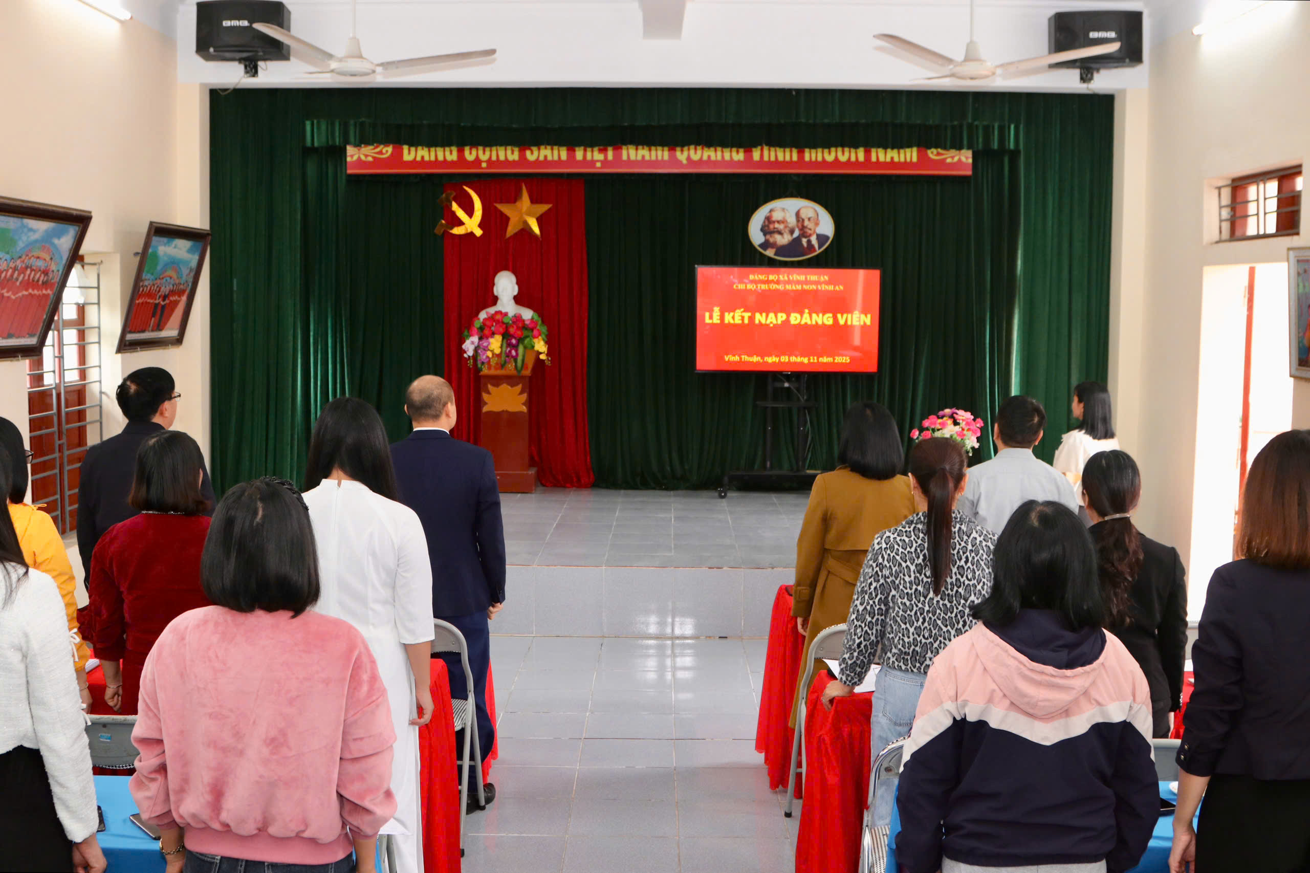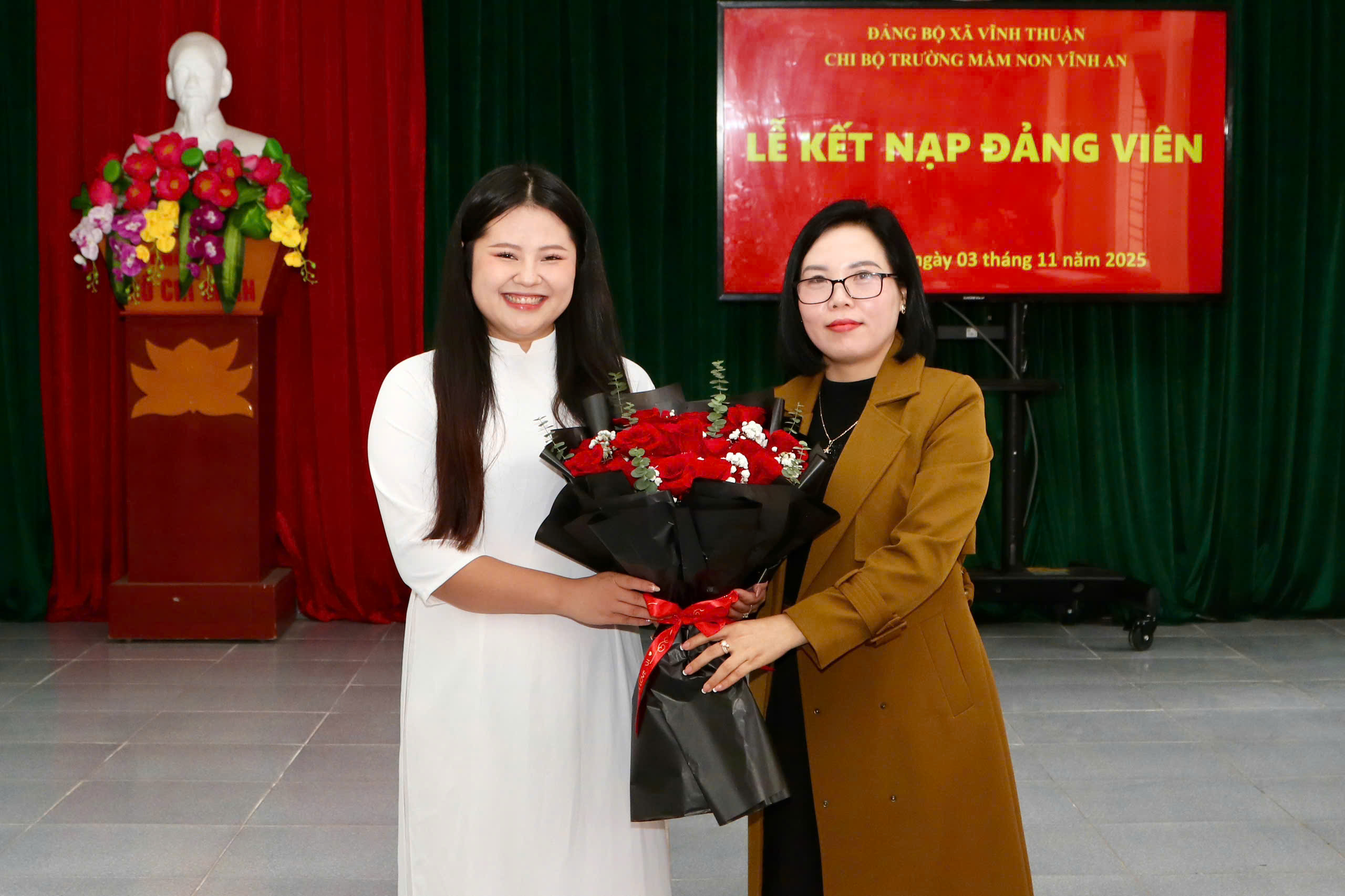 Đồng chí Bùi Thị Thúy, Bí thư Chi bộ trường Mầm non Vĩnh An tặng hoa chúc mừngNhân dịp này, đồng chí Phạm Đình Quý đề nghị Chi bộ Trường Mầm non Vĩnh An tiếp tục quan tâm phát hiện, bồi dưỡng những quần chúng ưu tú để giới thiệu cho Đảng uỷ xã xem xét, tạo nguồn phát triển đảng viên mới, góp phần xây dựng Đảng bộ xã Vĩnh Thuận ngày càng vững mạnh.