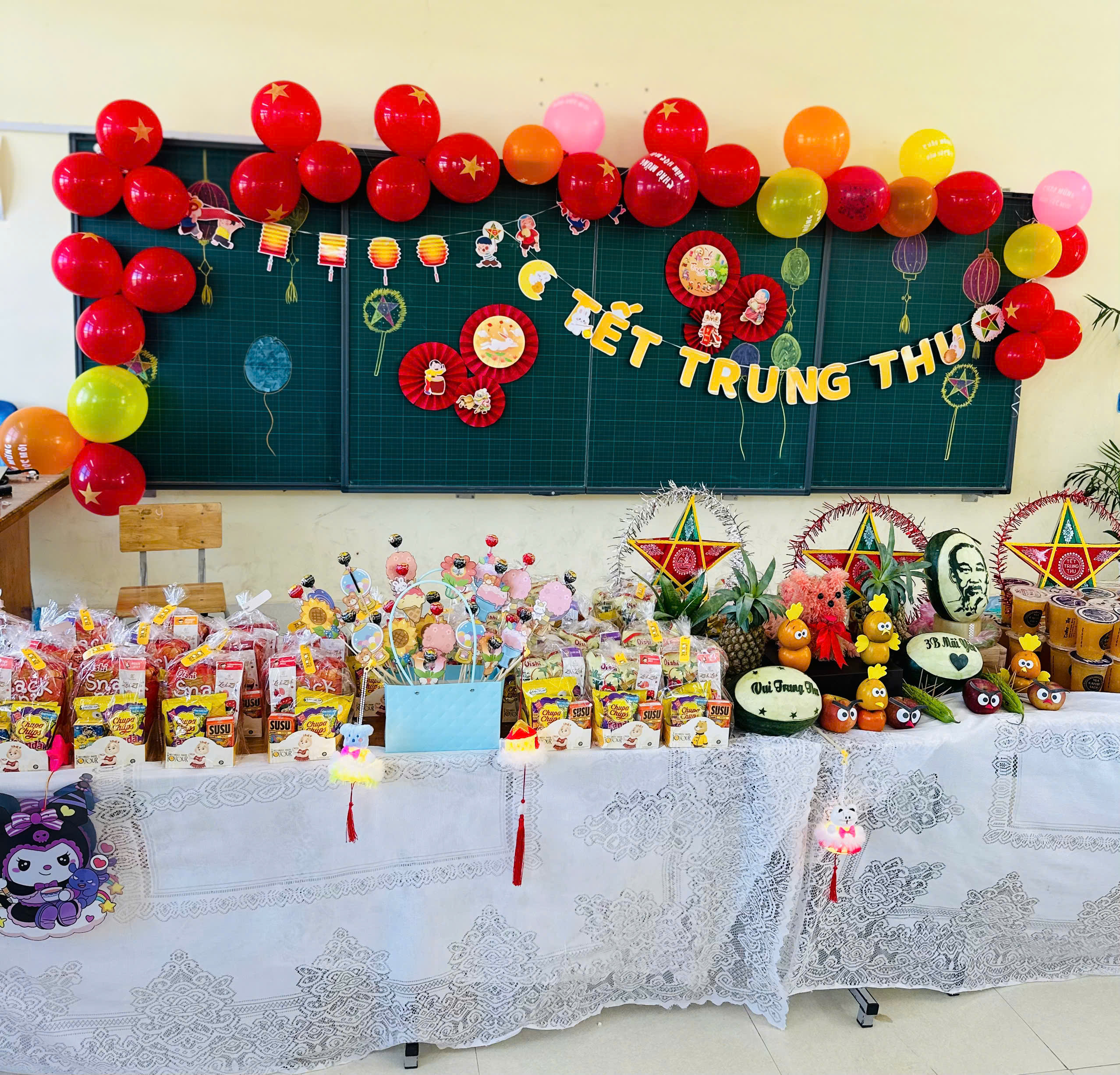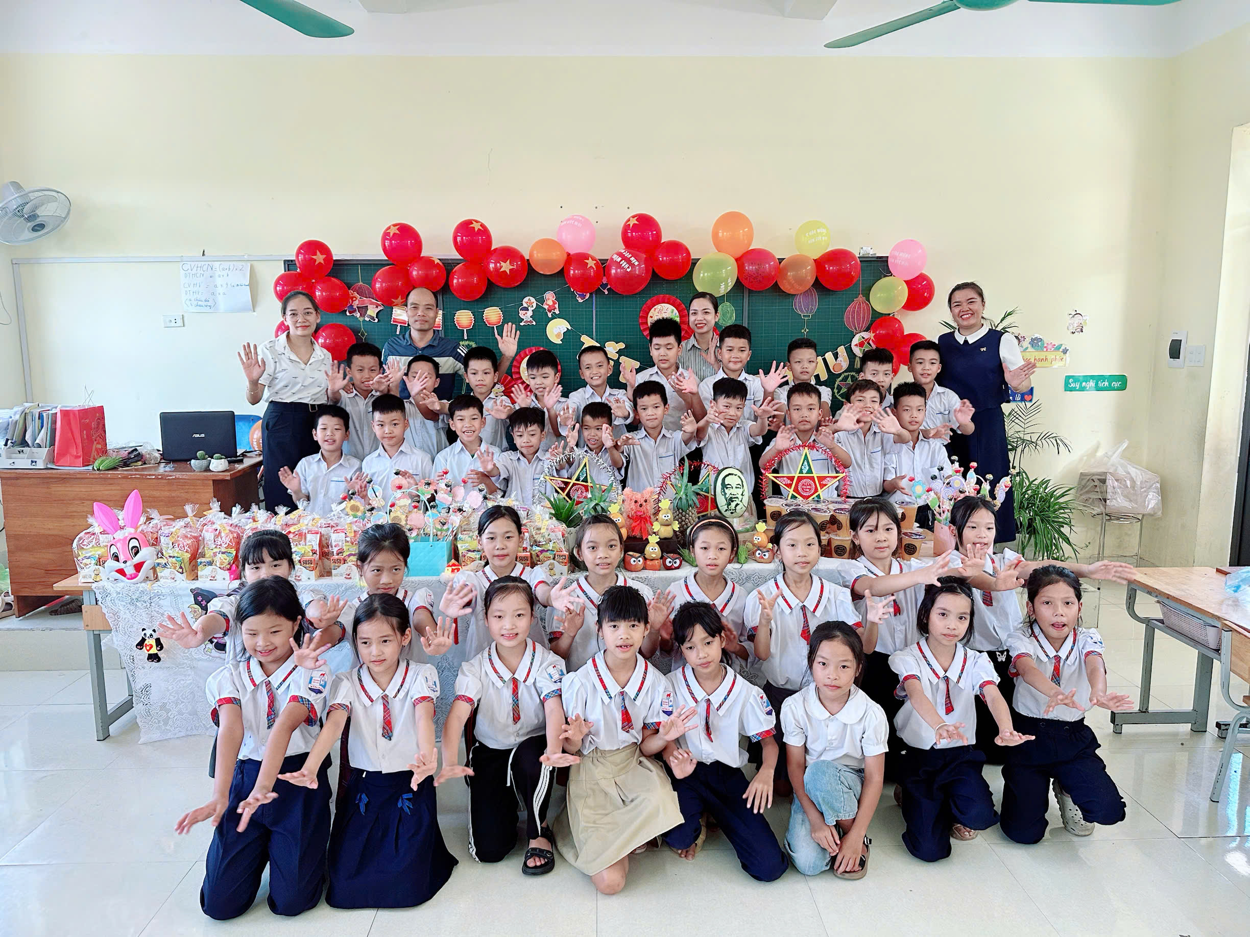 Đại diện lãnh đạo địa phương, các tổ chức, cá nhân hảo tâm tặng quà các em học sinh Cùng với hoạt động ở sân trường như: múa lân, múa rồng, văn nghệ, giao lưu kiến thức…, không khí Tết Trung thu cũng rộn ràng, tràn ngập tại các lớp với không khí thật ấm áp và chan chứa tình yêu thương. Với sự quan tâm, mong muốn các con có một ngày vui Trung thu trọn vẹn, Ban phụ huynh các lớp và các thầy, cô giáo chủ nhiệm đã chuẩn bị chu đáo để các con có ngày vui Trung thu thật sự vui tươi, ấm áp và ý nghĩa. Các bạn học sinh được vui vẻ, quây quần bên mâm cỗ với đủ các loại bánh kẹo, bánh nướng, bánh dẻo, những loại hoa quả đặc trưng của mùa thu và sắc màu rực rỡ của những chiếc đèn ông sao.