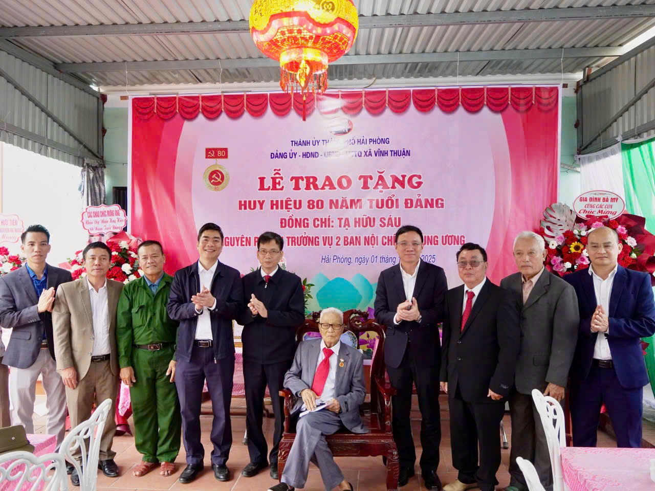 (Vinhthuan.haiphong.gov.vn) - Chiều 1/11, Đồng chí Đào Trọng Đức- Ủy viên Ban thường vụ Thành ủy- Phó chủ tịch HĐND thành phố dự và Trao Huy hiệu 80 năm tuổi Đảng tặng đồng chí Tạ Hữu Sáu- Nguyên Phó vụ trưởng vụ 2 Ban nội chính Trung ương tại nhà riêng ở thôn 7 An Bồ.