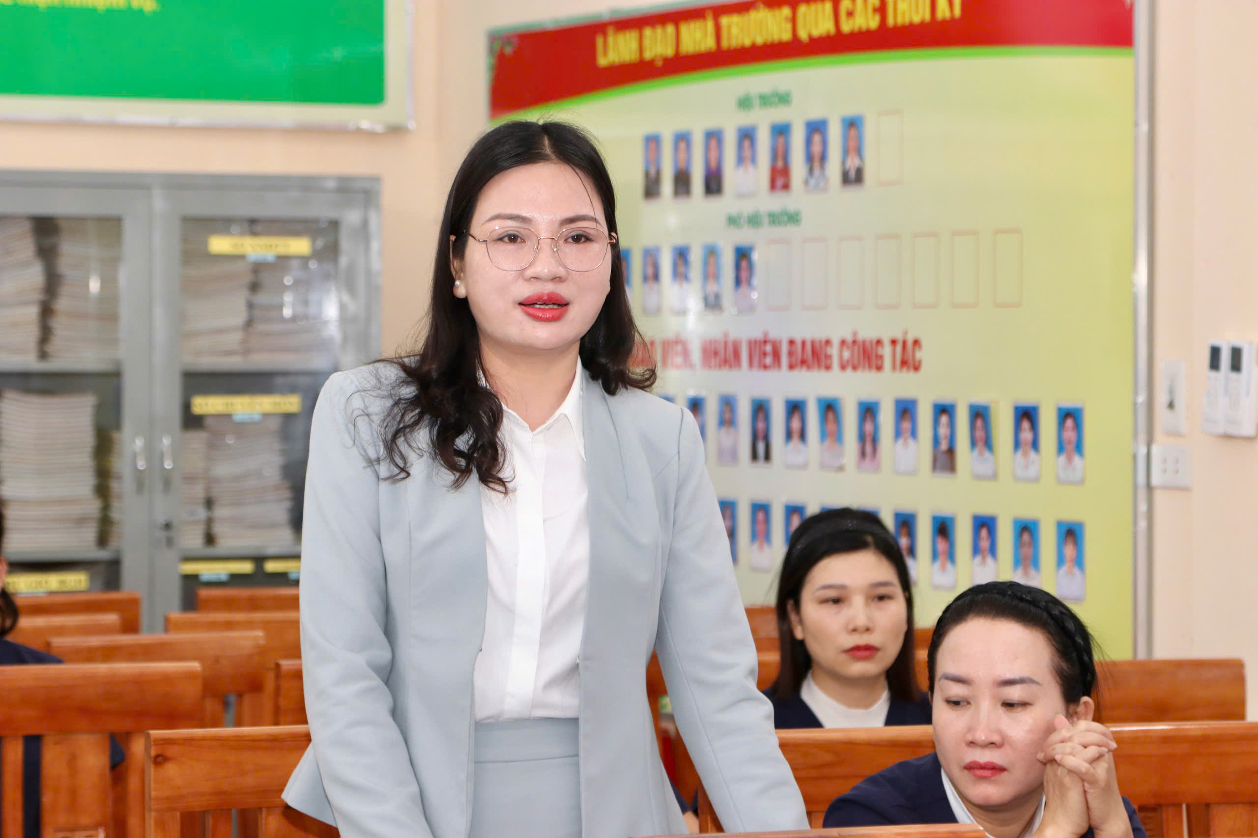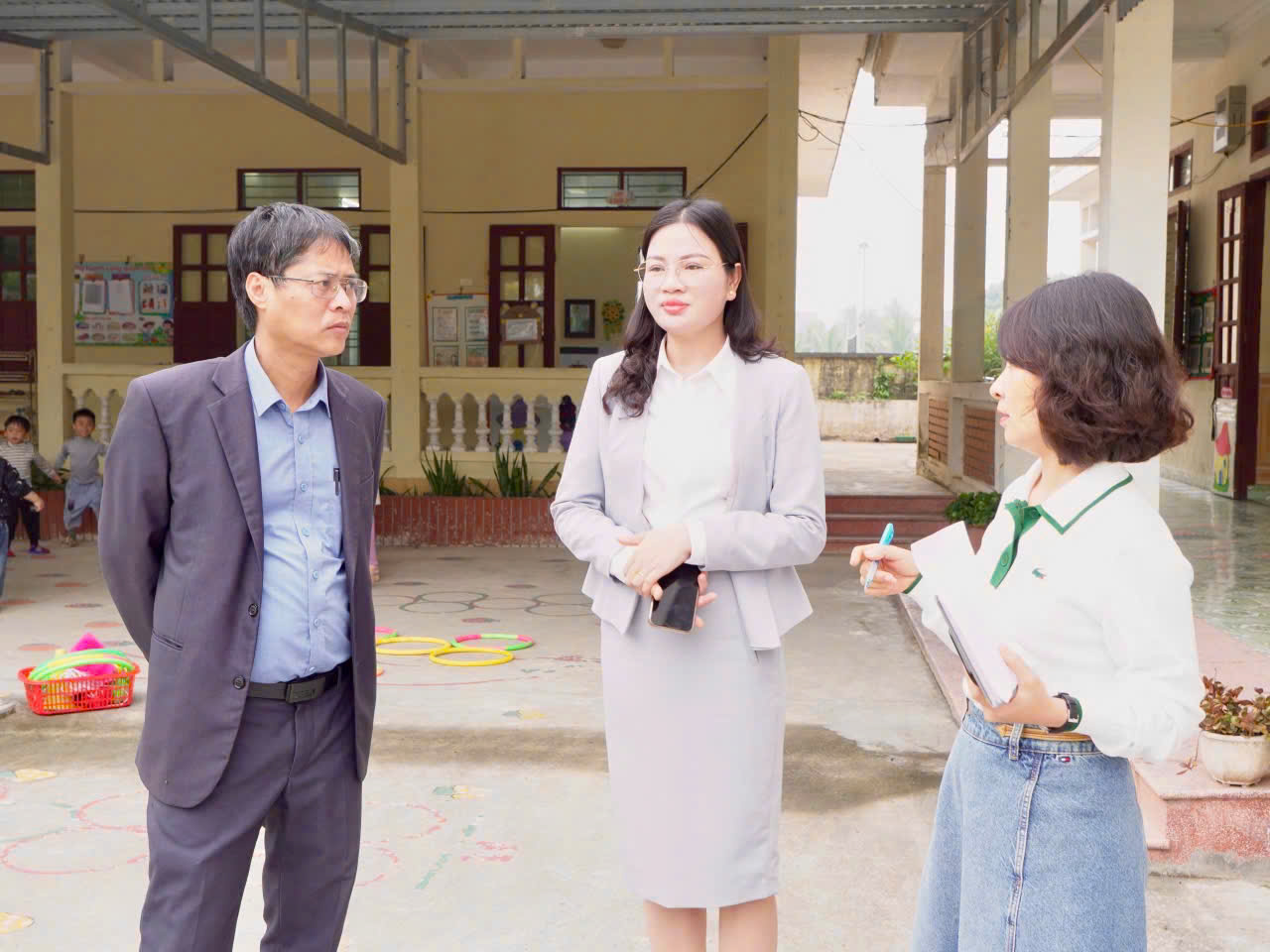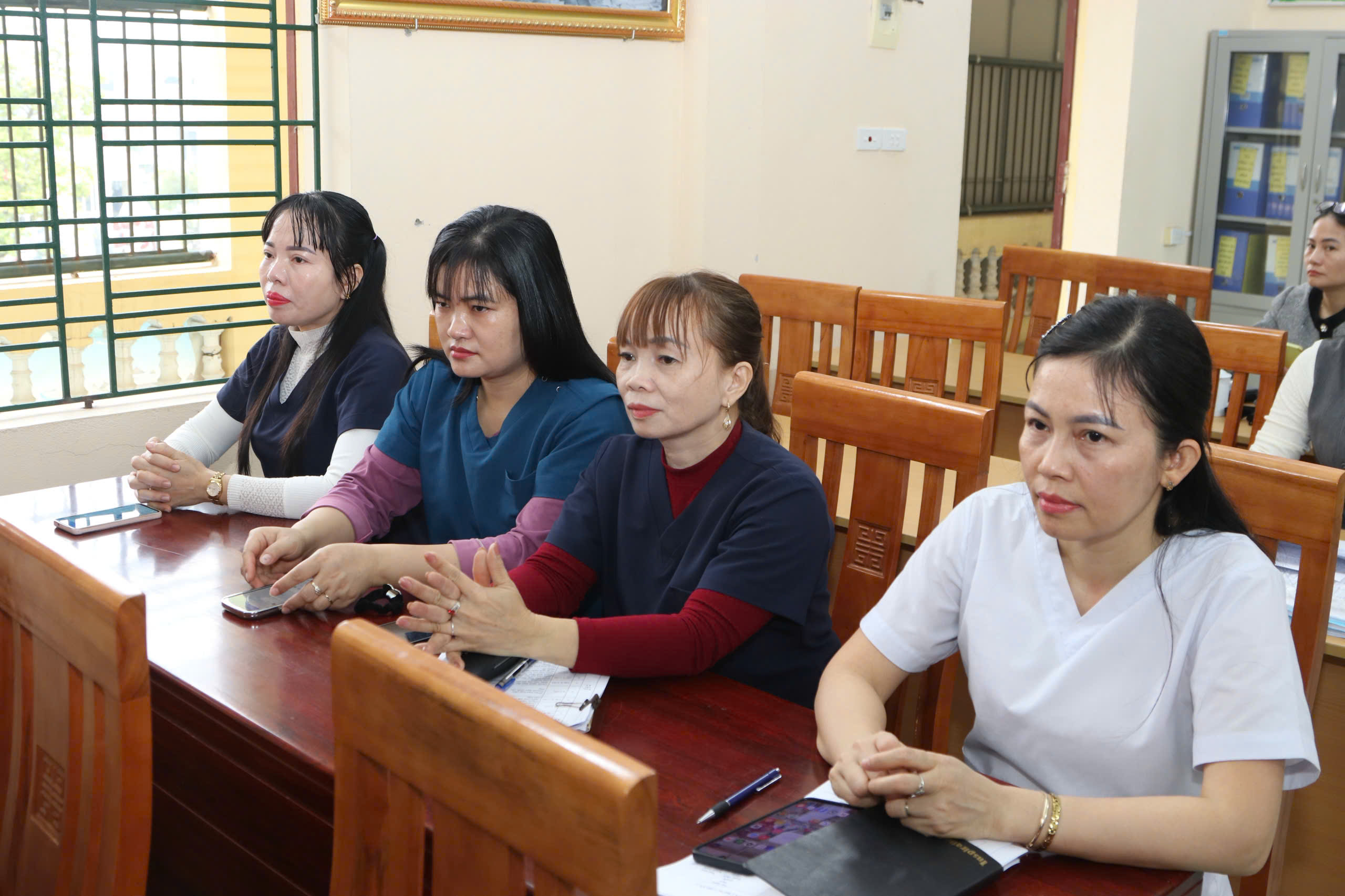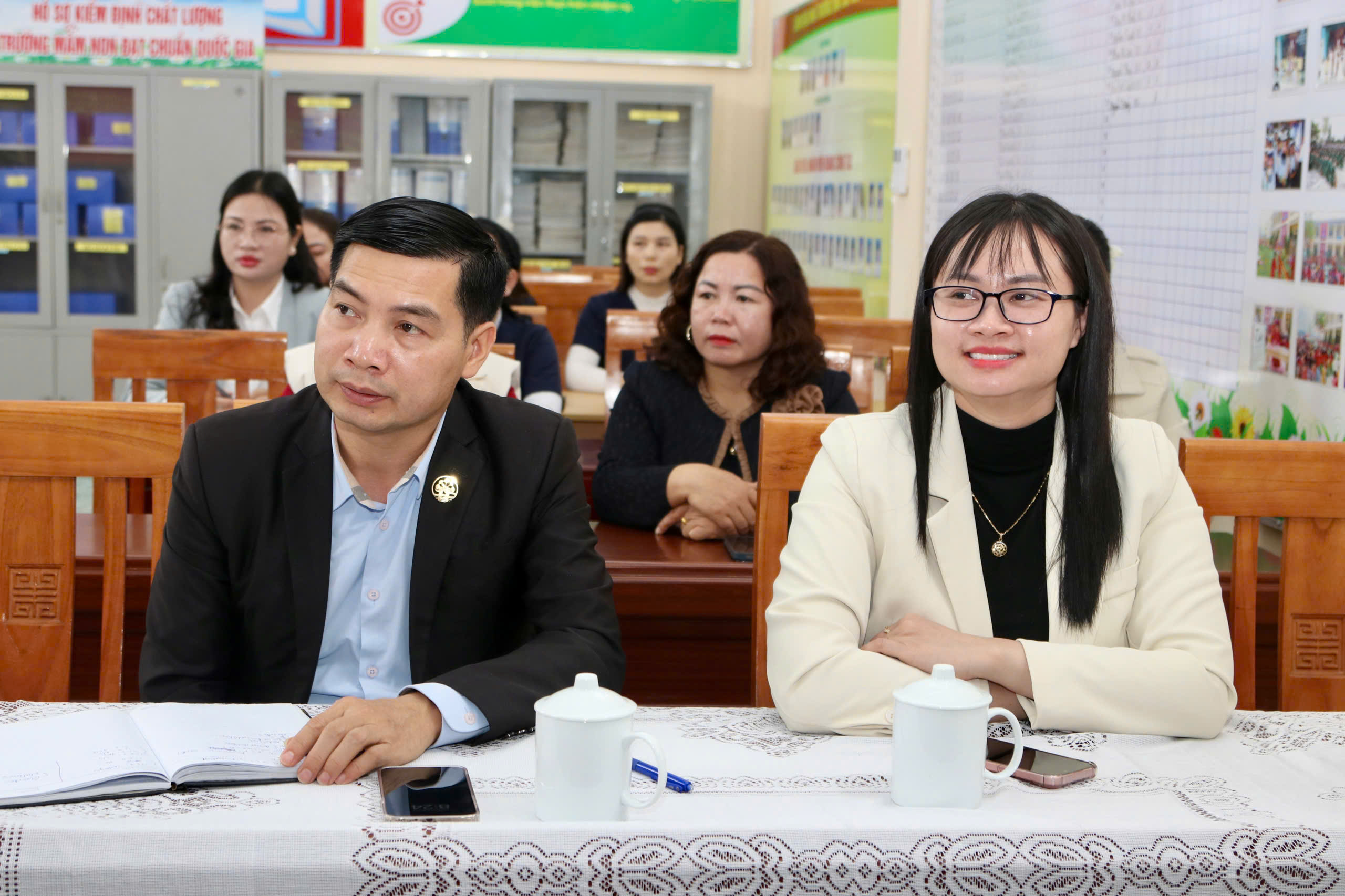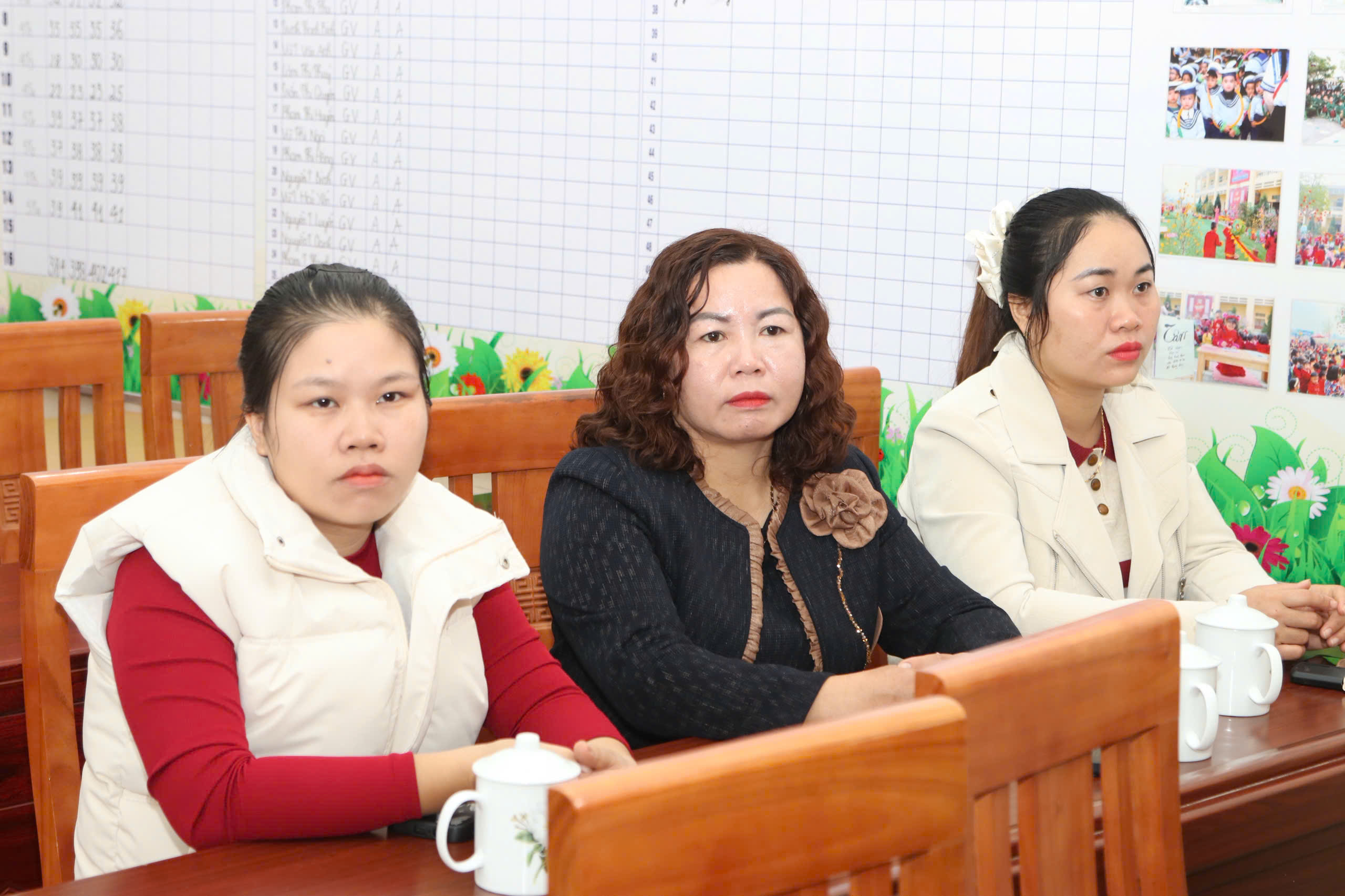 Các giao viên của trường tham gia Hội nghịTại buổi làm việc, Đoàn kiểm tra đã nghe lãnh đạo nhà trường báo cáo quá trình xây dựng trường đạt chuẩn quốc gia trên các lĩnh vực: cơ sở vật chất, đội ngũ giáo viên, chăm sóc – giáo dục trẻ và công tác quản lý. Đồng thời kiểm tra thực tế, đối chiếu minh chứng theo đúng các tiêu chuẩn quy định.