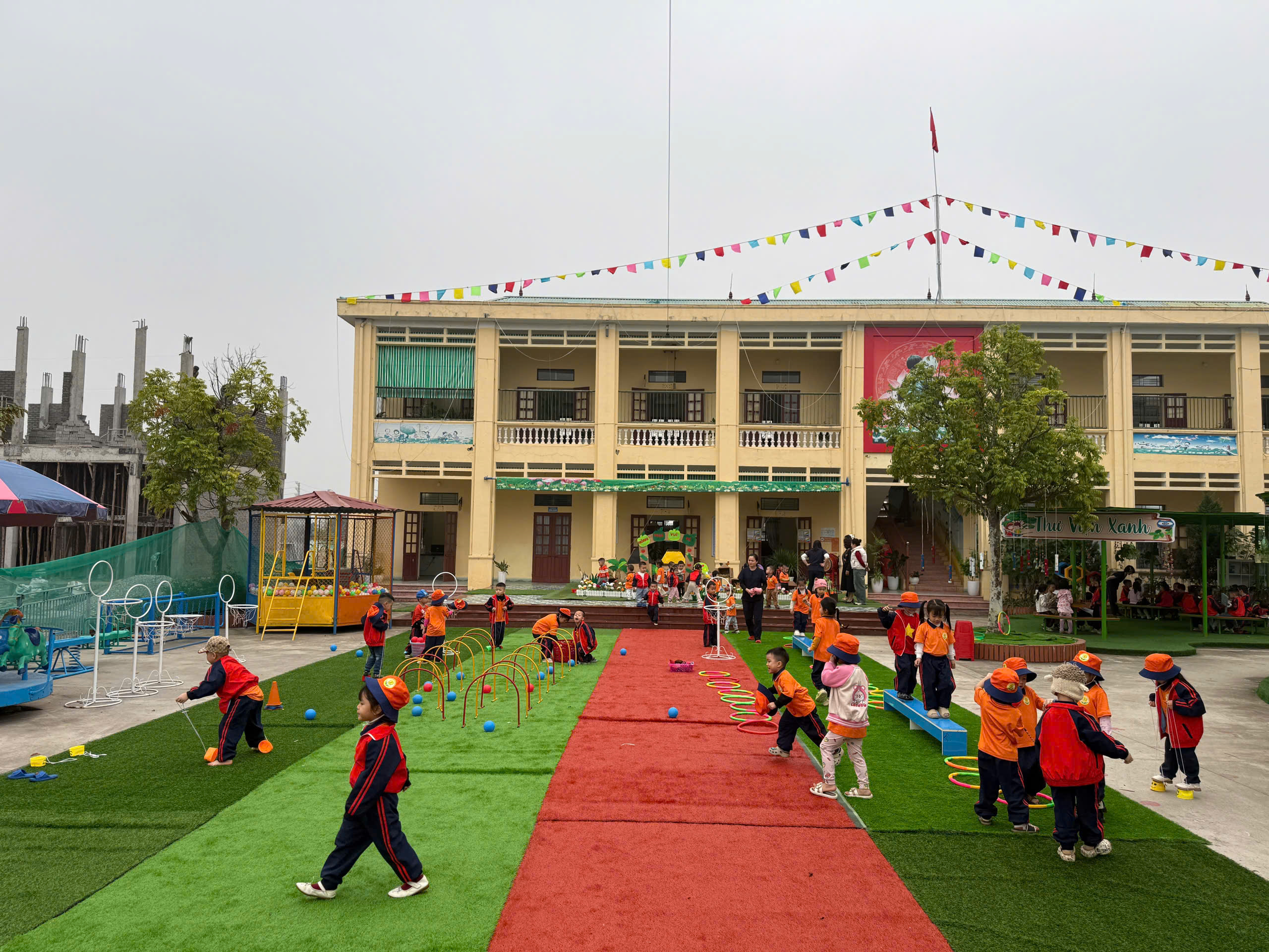Các hoạt động ngoài trời tại trườngBếp ăn bán trú đảm bảo vệ sinh an toàn thực phẩm. Công tác nuôi dưỡng, chăm sóc trẻ được chú trọng, khẩu phần ăn được xây dựng hợp lý. Công tác quản lý được thực hiện nghiêm túc, hệ thống hồ sơ được niêm yết và lưu trữ đúng quy định. Nhà trường cũng thực hiện tốt các phương án bảo đảm an ninh trật tự, phòng chống tai nạn thương tích, phòng cháy chữa cháy và phòng chống dịch bệnh.