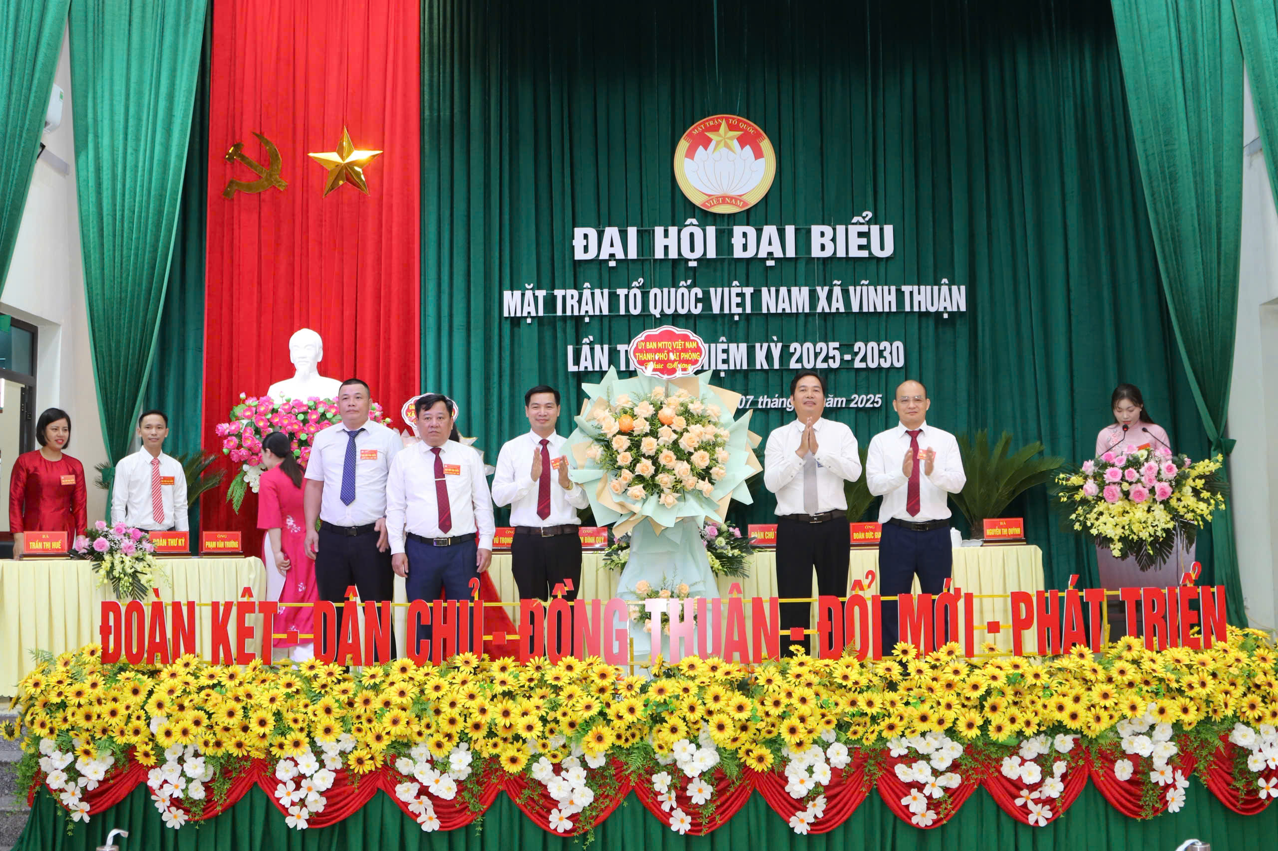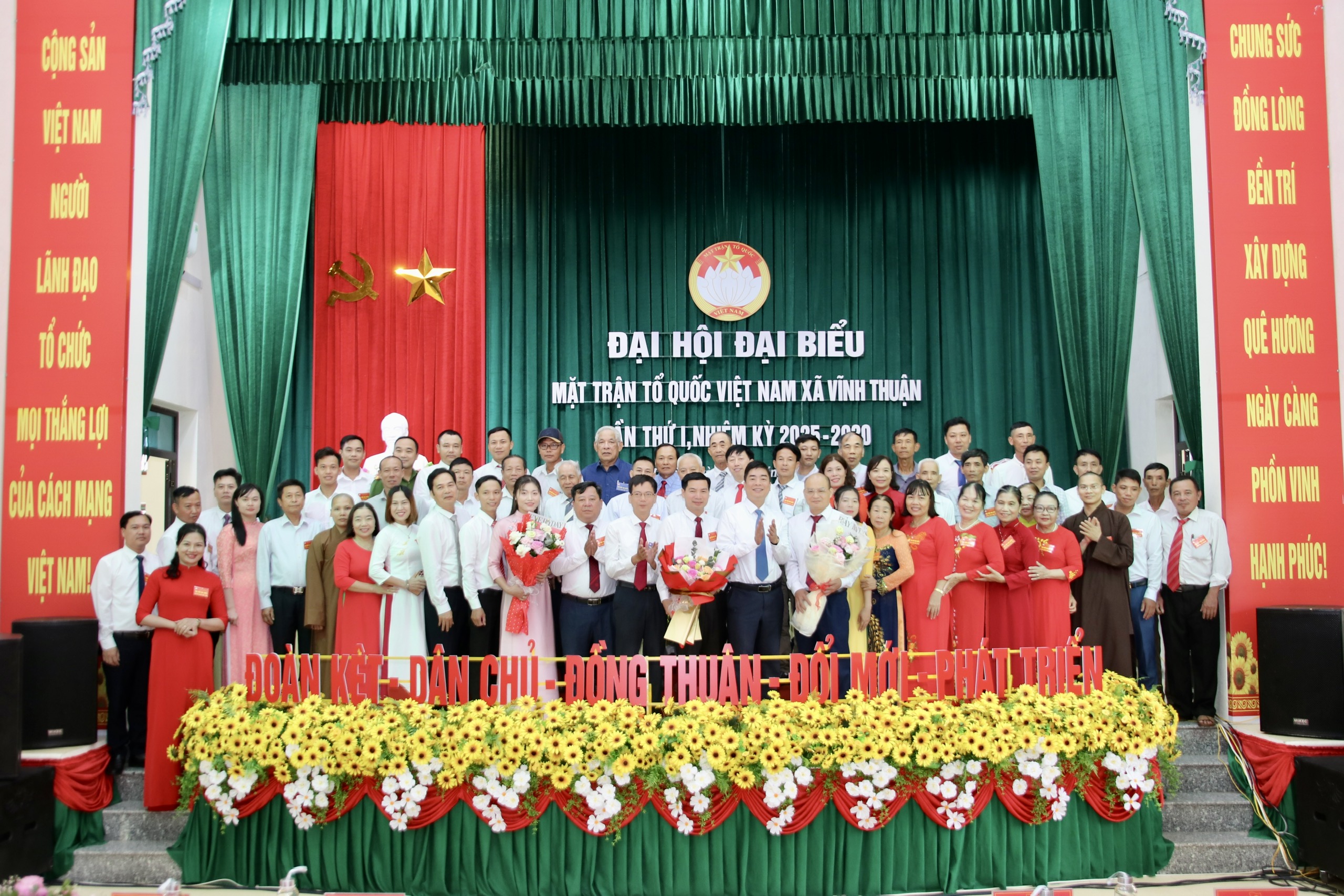 Ban chấp hành MTTQ Việt nam xã nhiệm kì 2025 -2030 ra mắt Đại hộiĐại hội đã biểu quyết thông qua Nghị quyết Đại hội lần thứ I, nhiệm kỳ 2025–2030 với 15 chỉ tiêu, 6 chương trình hành động trọng tâm. Đại hội hiệp thương cử 59 Ủy viên Ủy ban MTTQ Việt Nam xã Vĩnh Thuận khóa I, bầu đoàn đại biểu dự Đại hội MTTQ Việt Nam thành phố. Đồng chí Đoàn Đức Giang được tín nhiệm giữ chức Chủ tịch Ủy ban MTTQ Việt Nam xã Vĩnh Thuận nhiệm kỳ 2025–2030.