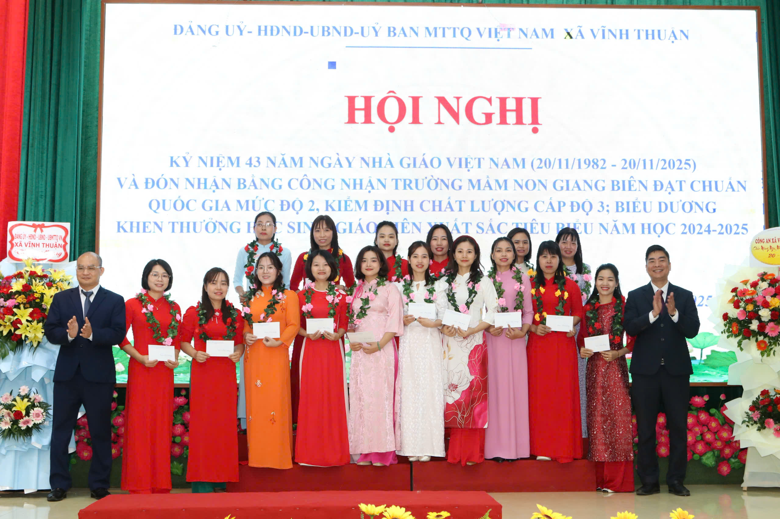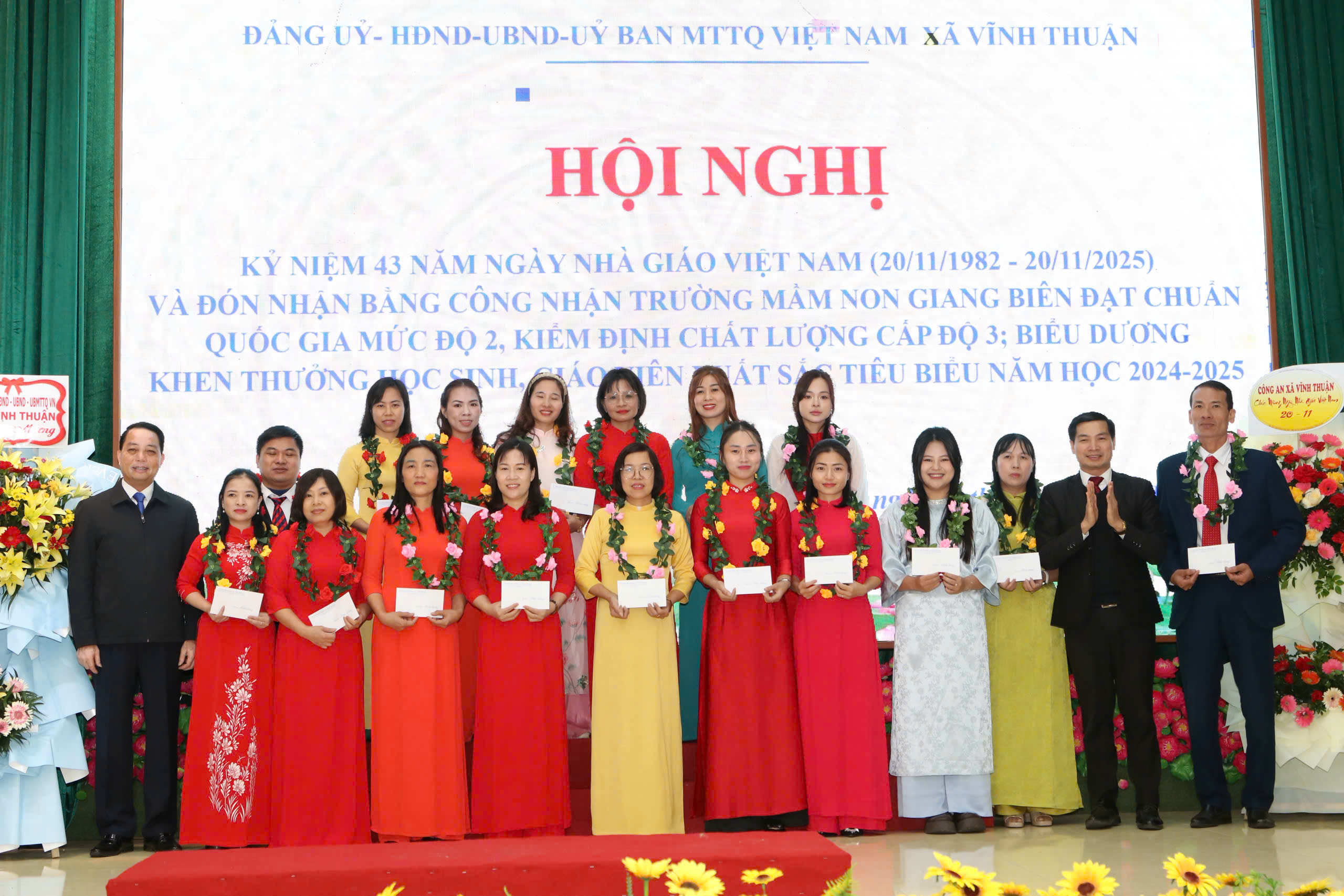 (Vinhthuan.haiphong.gov.vn) - Sáng ngày 19/11, UBND xã Vĩnh Thuận long trọng tổ chức Hội nghị kỉ niệm 43 năm Ngày Nhà giáo Việt Nam (20/11/1982 – 20/11/2025) và đón nhận Bằng công nhận Trường Mầm non Giang Biên đạt chuẩn Quốc gia mức độ 2, kiểm định chất lượng giáo dục cấp độ 3; đồng thời biểu dương giáo viên, học sinh xuất sắc năm học 2024 – 2025.