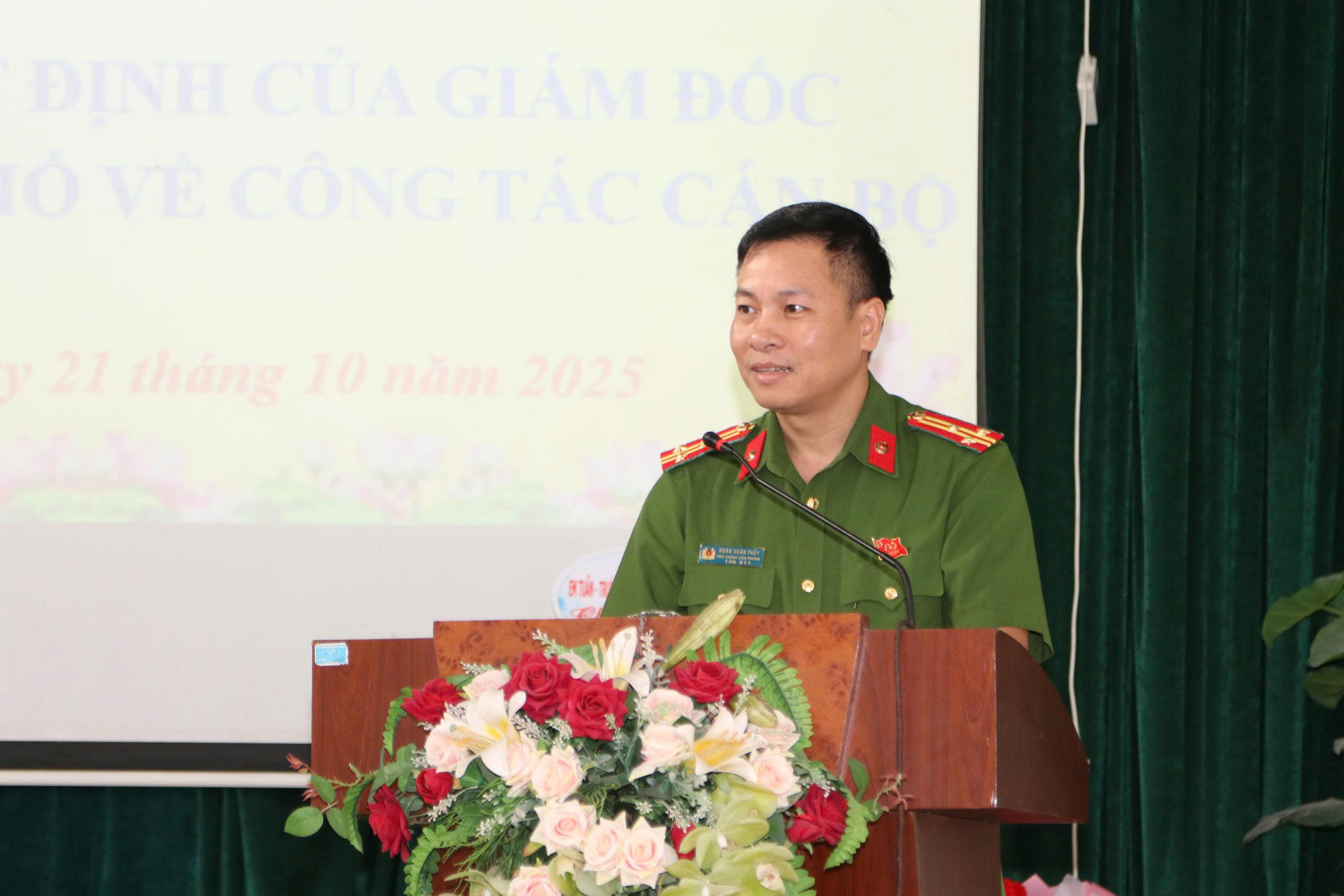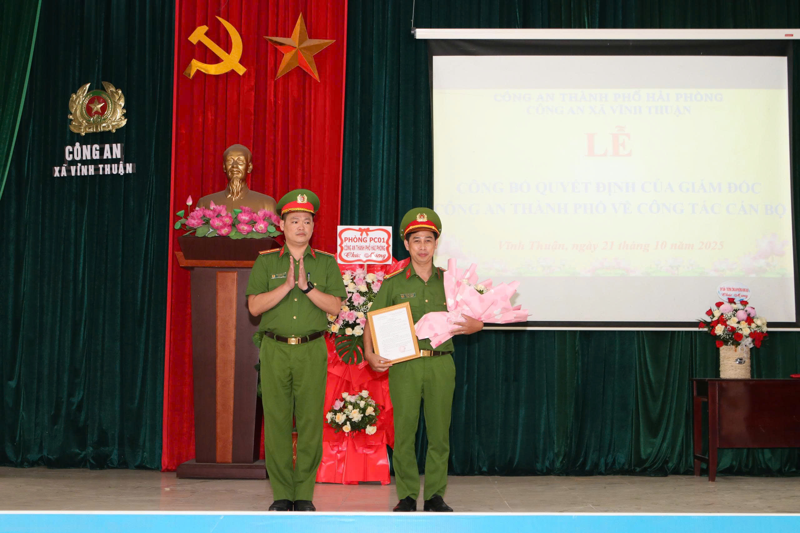Quang cảnh hội nghịTại buổi lễ đã công bố Quyết định của Giám đốc Công an thành phố Hải Phòng, về việc điều động Trung tá Nguyễn Văn Độ, nguyên Phó Đội trưởng Đội Điều tra – Văn phòng Cơ quan Cảnh sát điều tra thành phố, đến nhận công tác và giữ chức vụ Phó Trưởng Công an xã Vĩnh Thuận, thành phố Hải Phòng, kể từ ngày 21/10/2025.