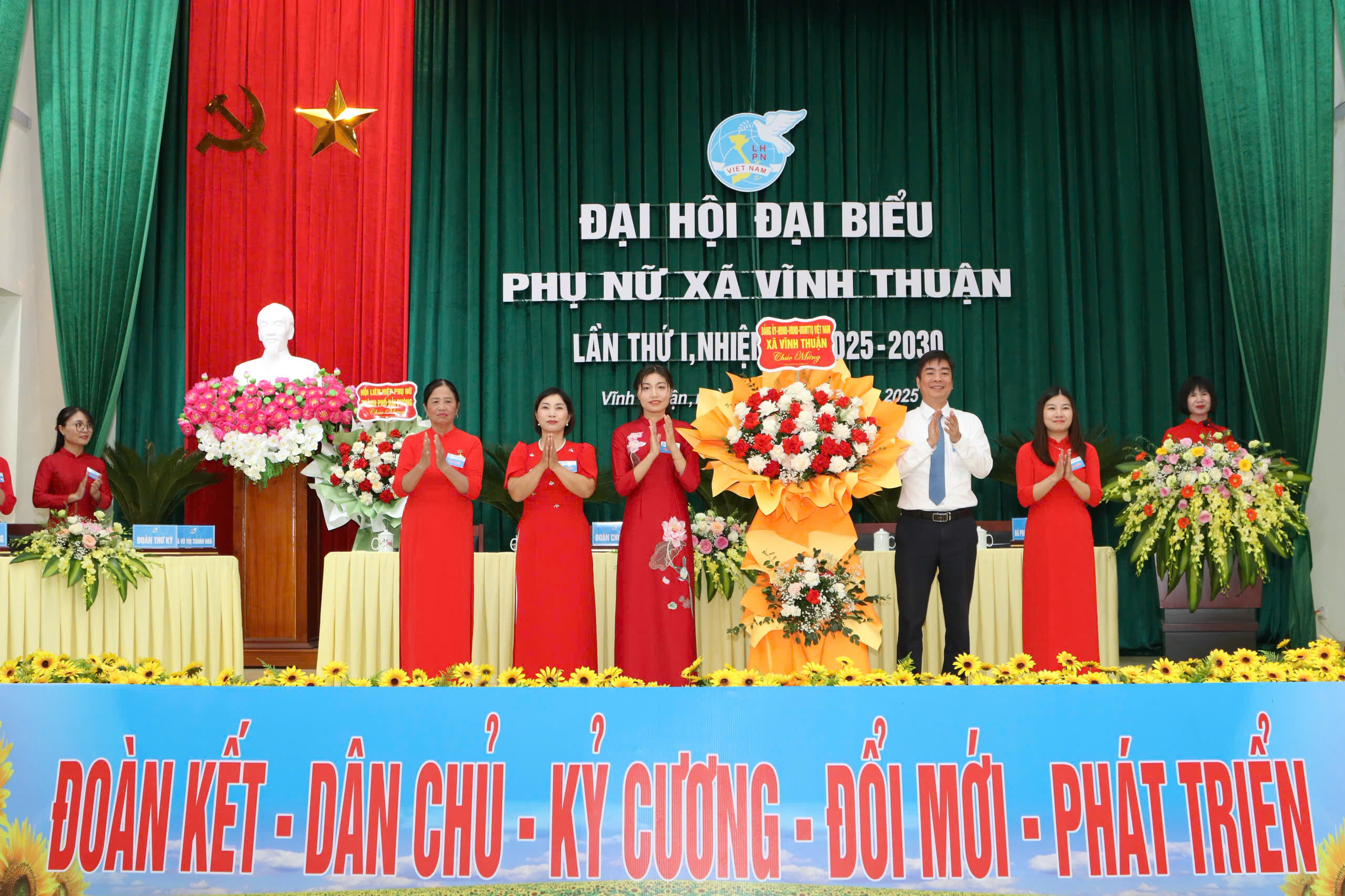 Đồng chí Đinh Phú Hiếu, Chủ tịch UBND xã Vĩnh Thuận tặng hoa Đại hộiCông tác hỗ trợ phụ nữ phát triển kinh tế đạt nhiều kết quả nổi bật. Hội đã phối hợp với các ngân hàng, quỹ tín dụng cho 830 hộ phụ nữ vay hơn 46,7 tỷ đồng phát triển sản xuất, kinh doanh; 19 hộ phụ nữ được hỗ trợ khởi nghiệp, vay vốn mở cửa hàng, xưởng sản xuất nhỏ; tổ chức 75 lớp tập huấn khoa học kỹ thuật, 3 buổi tư vấn việc làm cho gần 400 lao động nữ. Trong nhiệm kỳ, có 6 tập thể và 18 cá nhân được Hội LHPN cấp trên khen thưởng; 100% chi hội trưởng được hưởng phụ cấp bồi dưỡng hằng tháng và được tạo điều kiện kiêm nhiệm các vị trí công tác cộng đồng. Công tác tuyên truyền, vận động, ứng dụng công nghệ thông tin trong hoạt động Hội có bước tiến rõ rệt khi 100% cán bộ Hội được tập huấn kỹ năng chuyển đổi số, khai thác hiệu quả các nền tảng như Fanpage, Zalo, Facebook trong tuyên truyền và sinh hoạt trực tuyến.