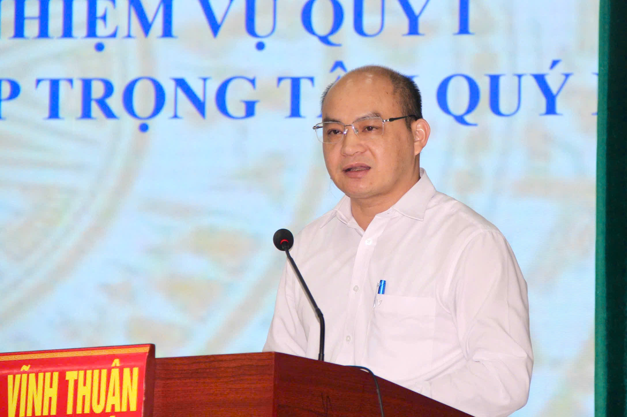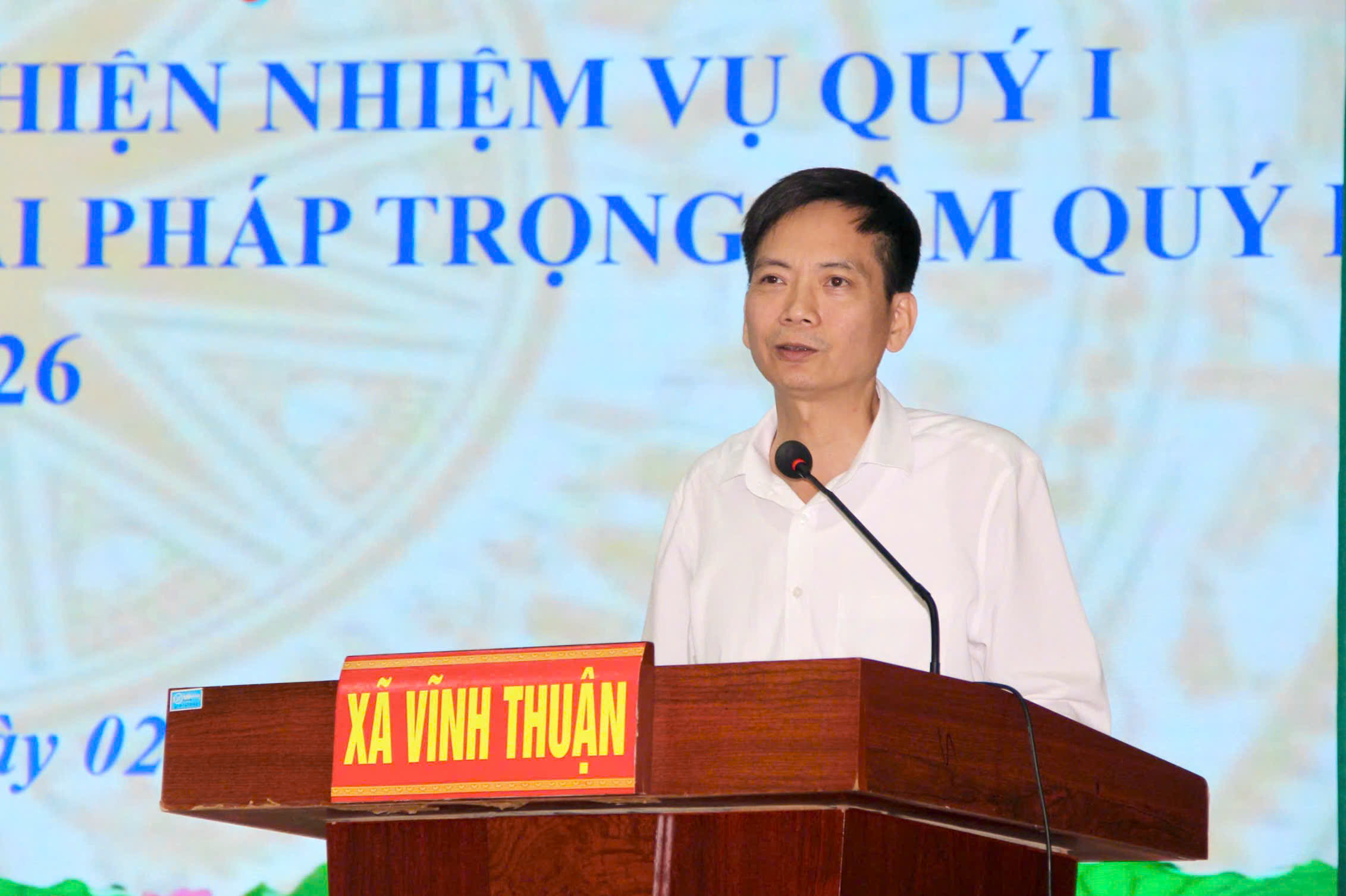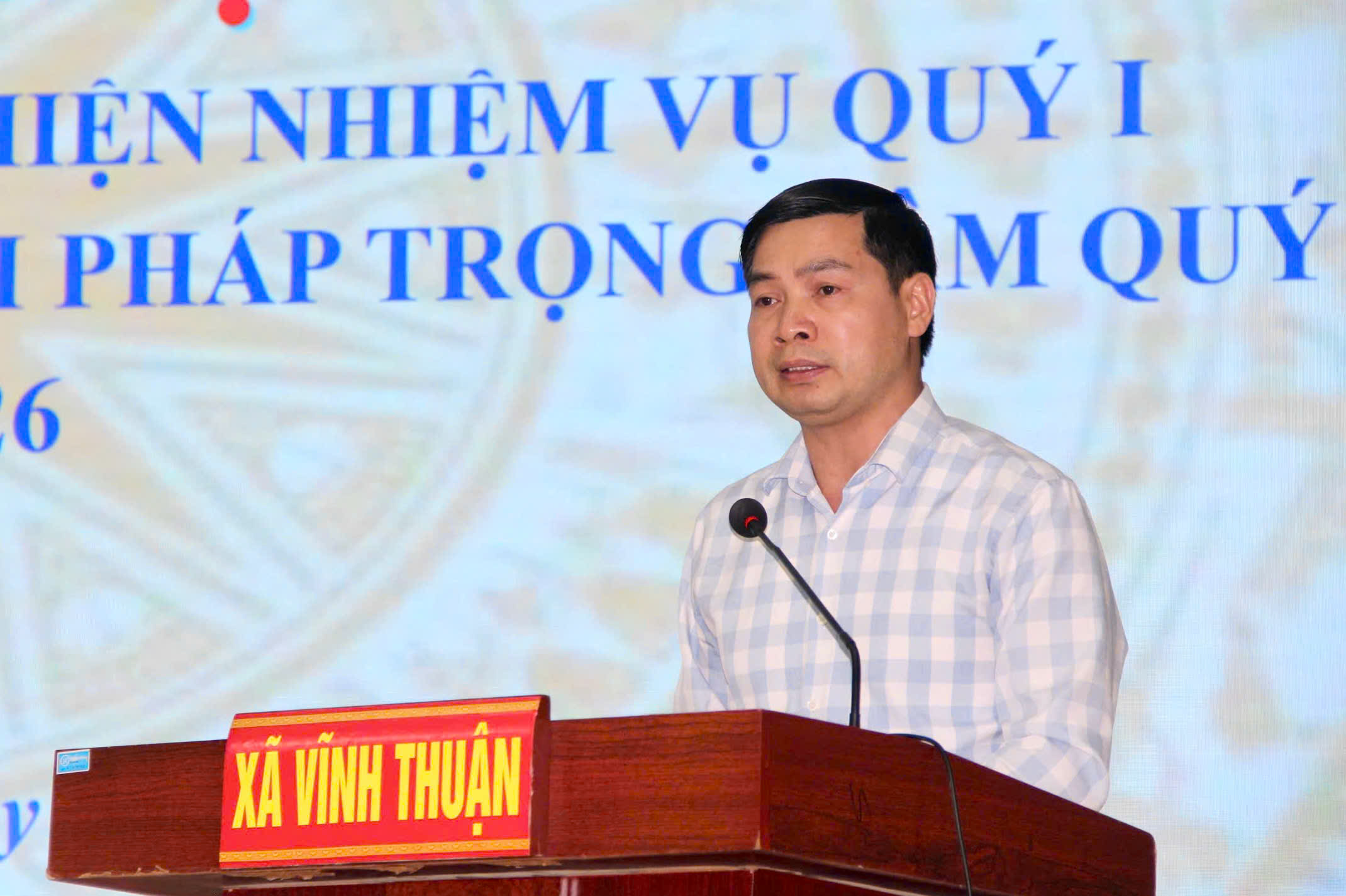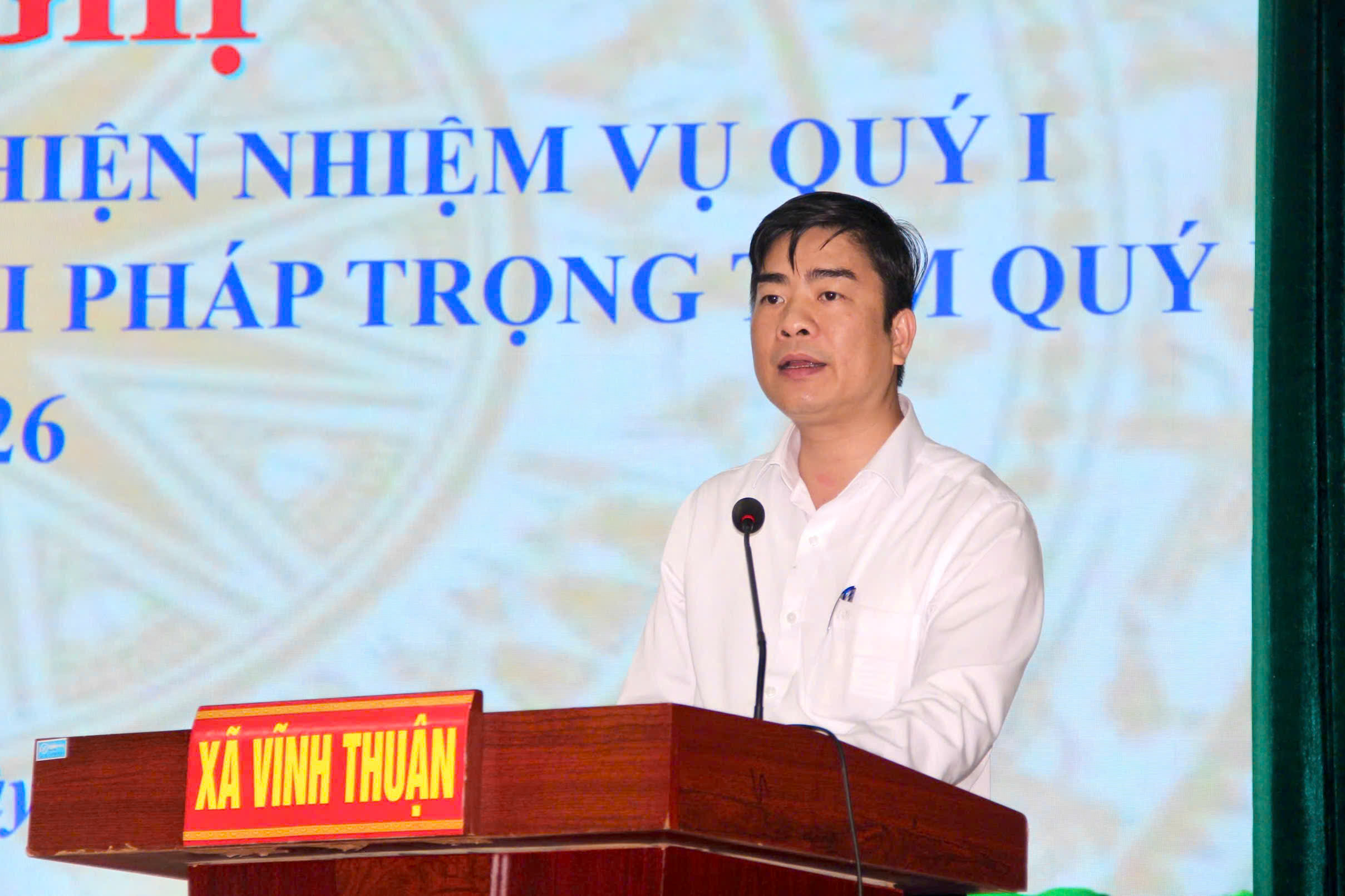 Đồng chí Phạm Đình Quý- Phó Bí thư Thường trực Đảng ủy xã báo cáo tại hội nghịTại hội nghị đã tập trung đánh giá toàn diện tình hình thực hiện nhiệm vụ quý 1 năm 2026. Trong Quý I năm 2026, mặc dù còn nhiều khó khăn, thách thức, song dưới sự lãnh đạo, chỉ đạo trực tiếp, toàn diện của Đảng ủy xã Vĩnh Thuận, sự điều hành quyết liệt của chính quyền, sự phối hợp chặt chẽ của Mặt trận Tổ quốc và các tổ chức chính trị – xã hội, cùng sự đồng thuận của Nhân dân, địa phương đã đạt được nhiều kết quả quan trọng, khá toàn diện trên các lĩnh vực.