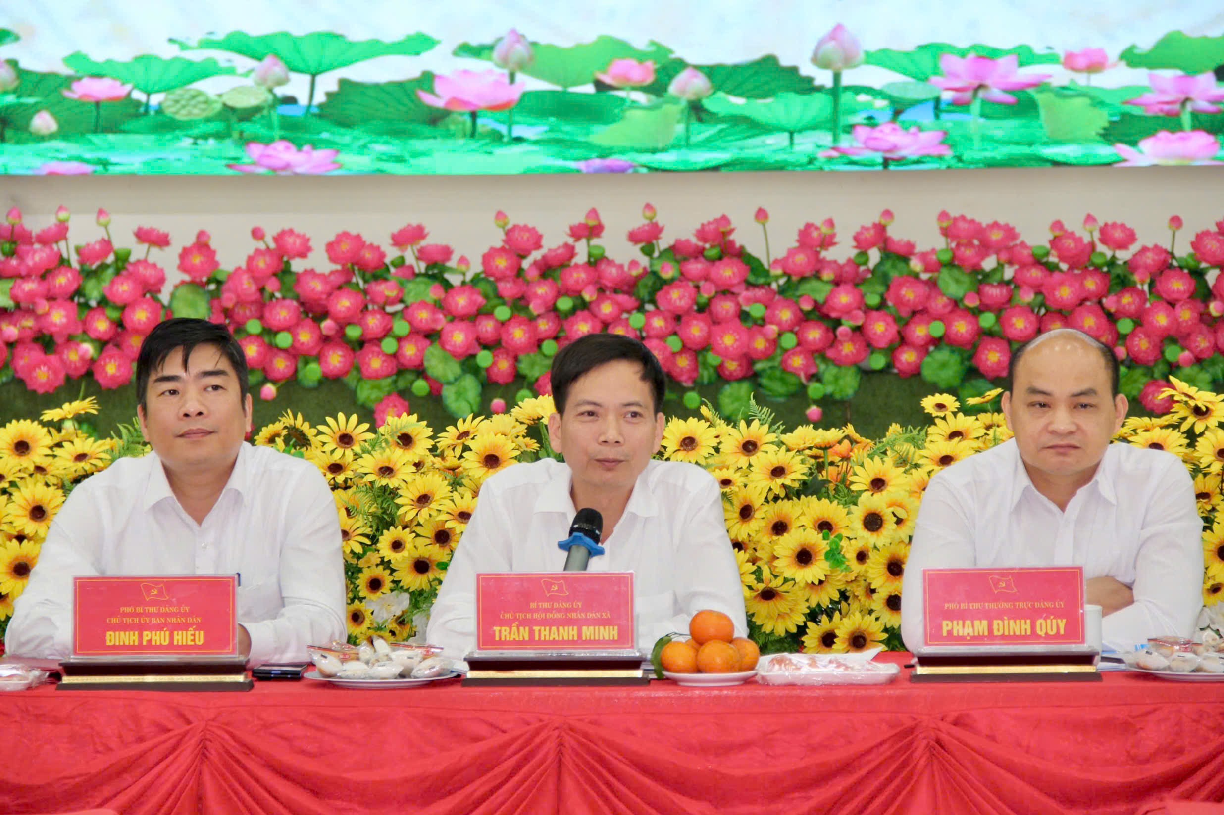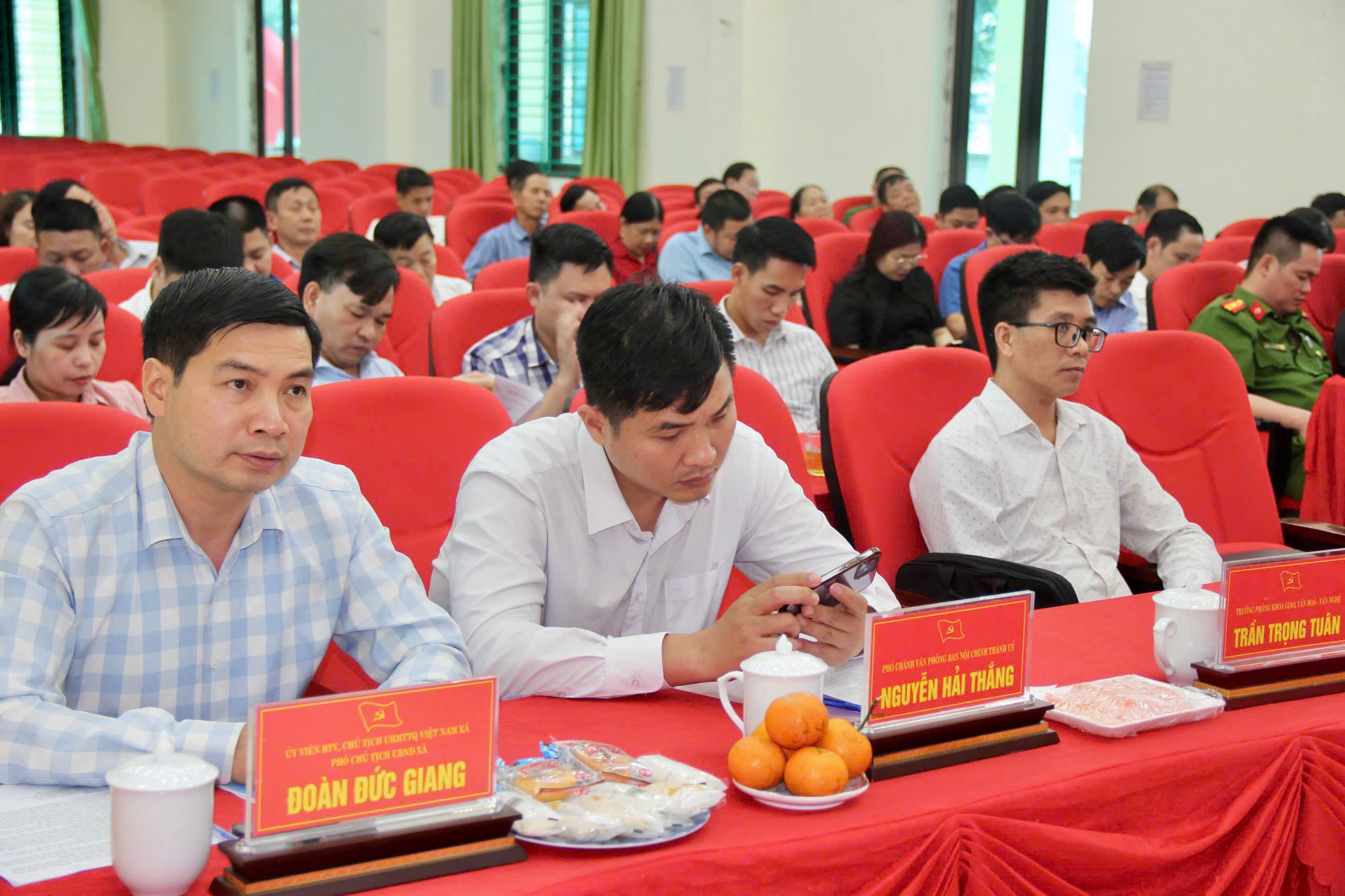 Đồng chí Trần Thanh Minh – Bí thư Đảng ủy xã – Chủ tịch HĐND xã chủ trì hội nghị. Dự hội nghị có lãnh đạo các cơ quan Ban tuyên giáo và Dân vận Thành ủy, Ban Nội chính Thành ủy; đồng chí Đồng chí Trần Thanh Minh – Bí thư Đảng ủy xã – Chủ tịch HĐND xã chủ trì hội nghị; đồng chí Phạm Đình Quý- Phó Bí thư Thường trực Đảng ủy, đồng chí Đinh Phú Hiếu- Phó Bí thư đảng ủy- Chủ tịch UBND xã; các đồng chí trong Ban thường vụ Đảng ủy, Ban Chấp hành Đảng bộ xã, Thường trực Hội đồng nhân dân, Ủy ban nhân dân, Ủy ban MTTQ Việt Nam xã; Lãnh đạo các ban, phòng, đơn vị sự nghiệp thuộc Đảng ủy, Hội đồng nhân dân, Ủy ban nhân dân, Ủy ban Mặt trận Tổ quốc Việt Nam xã, Ủy viên Ủy ban Kiểm tra Đảng ủy; Bí thư chi, đảng bộ trực thuộc Đảng ủy.