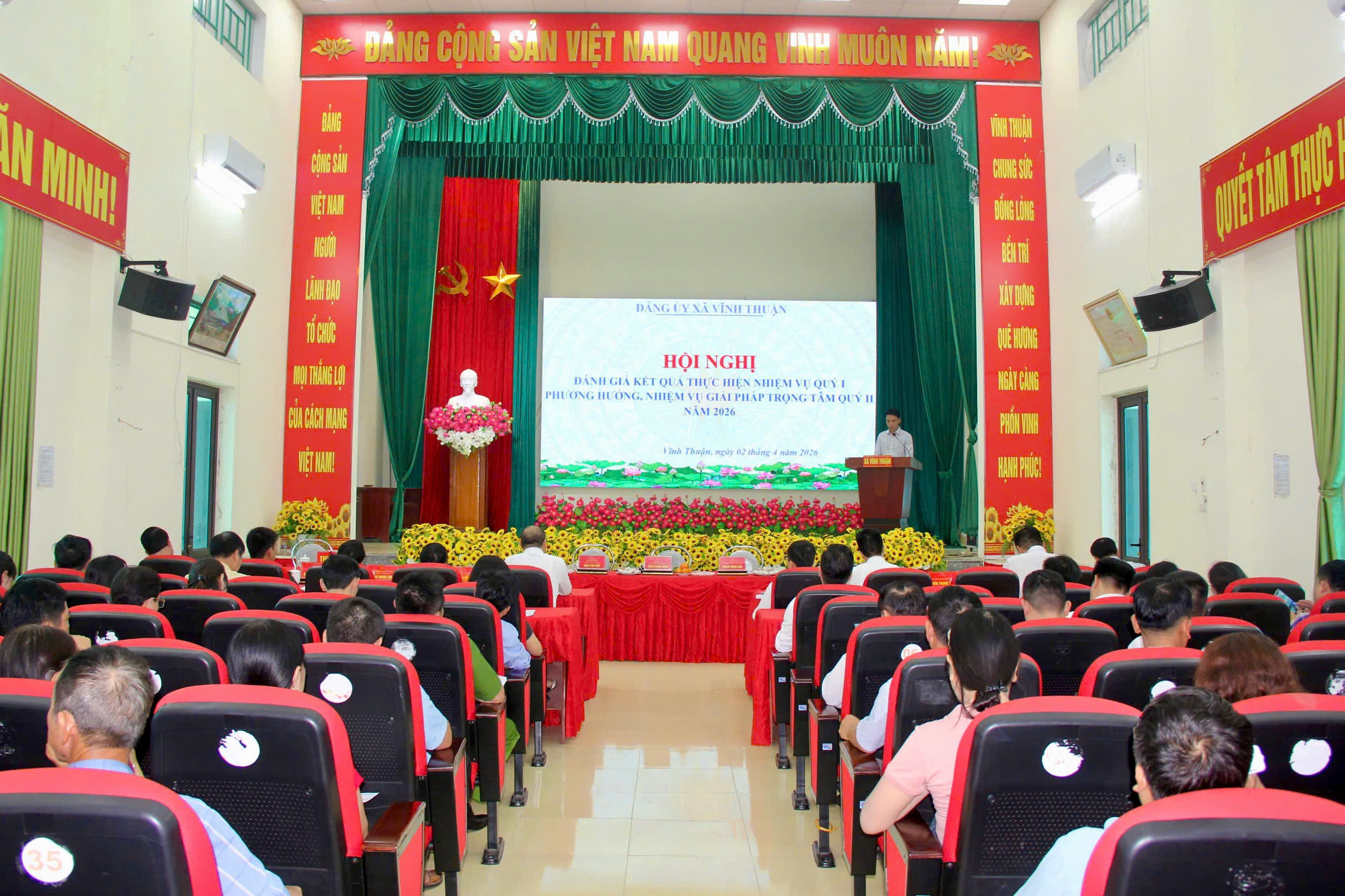 (Vinhthuan.haiphong.gov.vn) - Chiều 2/4/2026, Ban Thường vụ Đảng ủy xã Vĩnh Thuận tổ chức Hội nghị đánh giá kết quả thực hiện nhiệm vụ Quý 1/2026; phương hướng nhiệm vụ, giải pháp trọng tâm Quý II/2026.