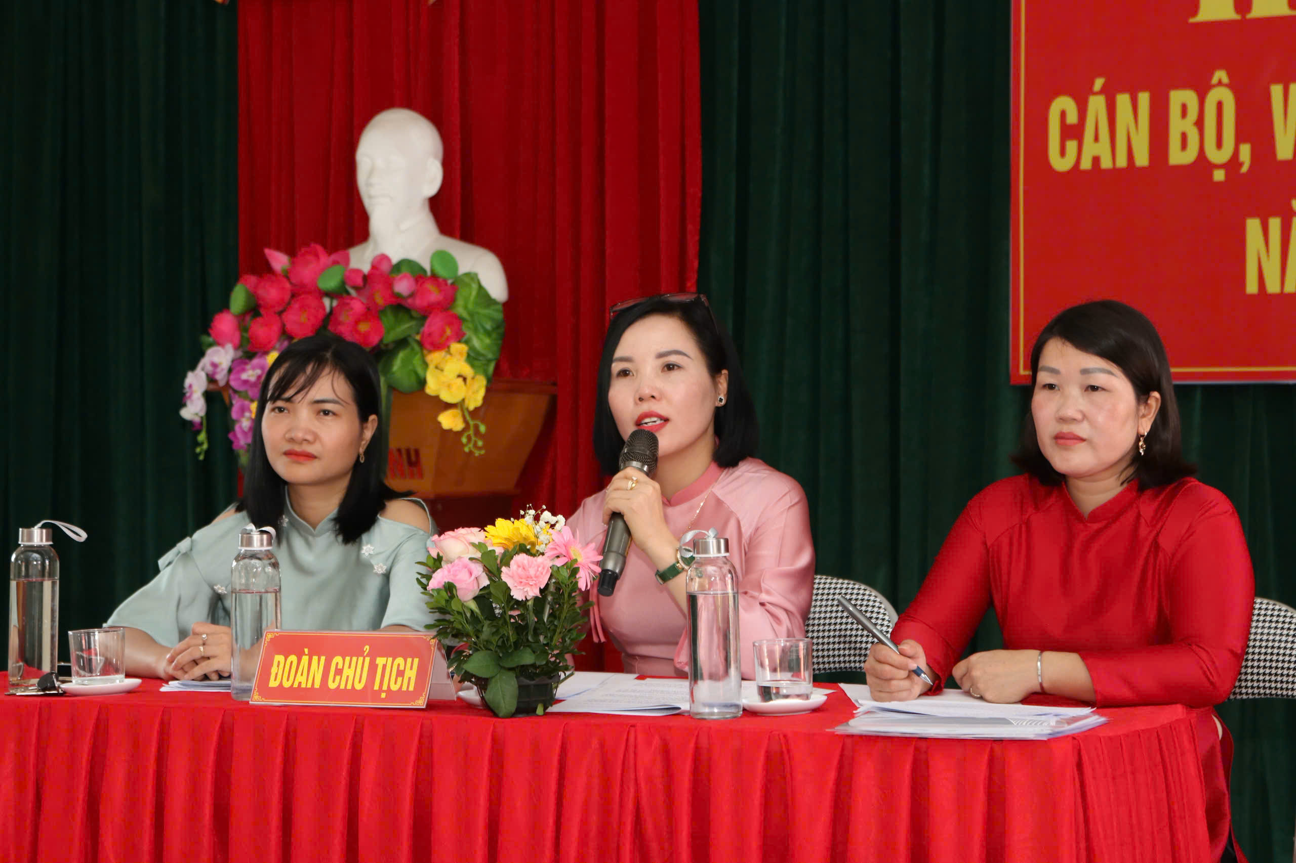 Đồng chí Nguyễn Thị Ngà, Trưởng phòng Văn hóa - Xã hội xã phát biểu cỉ đạo Hội nghịPhong trào thi đua chào mừng Ngày thành lập Đảng 3/2 và Ngày Quốc tế Phụ nữ 8/3 được triển khai với nhiều hoạt động ý nghĩa. Tại Hội thi vẽ tranh “Trường mầm non hạnh phúc – Tôn trọng quyền trẻ em”, 11 học sinh đạt giải cấp trường, trong đó 6 giải Nhất, 3 giải Nhì, 2 giải Khuyến khích; có 2 học sinh đạt giải cấp huyện. Kết quả đánh giá cuối năm, 100% cán bộ, giáo viên, nhân viên hoàn thành tốt nhiệm vụ, trong đó có 17,6% hoàn thành xuất sắc. Tập thể nhà trường được công nhận danh hiệu Tập thể Lao động tiên tiến, Chi bộ đạt “Chi bộ hoàn thành xuất sắc nhiệm vụ năm 2024”. 6 đồng chí đạt danh hiệu Chiến sĩ thi đua cơ sở, 1 đồng chí được nhận Bằng khen của UBND thành phố.