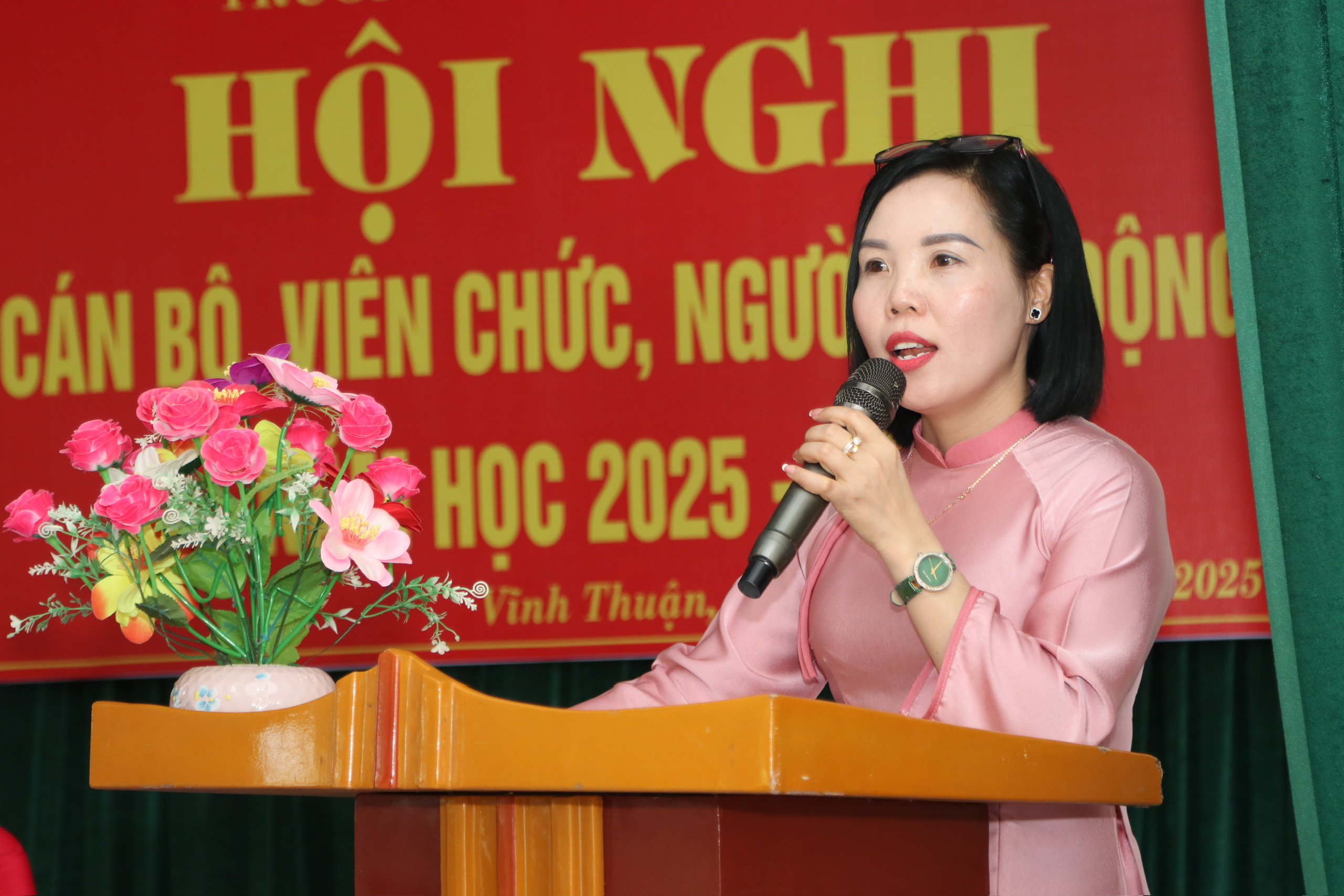 Đồng chí Bùi Thị Thúy, Phó Hiệu trưởng phụ trách trình bày báo cáo tại Hội nghịNăm học 2024–2025, tập thể Trường Mầm non Vĩnh An có 43 cán bộ, giáo viên, nhân viên, trong đó Ban giám hiệu 3 đồng chí, 30 giáo viên và 10 nhân viên. Đội ngũ giáo viên đạt chuẩn 98%, trên chuẩn 82%, có 1 giáo viên đang học đại học. Trường có 15 lớp với 360 trẻ, trong đó 319 trẻ mẫu giáo và 41 trẻ nhà trẻ. Với tinh thần đoàn kết, yêu nghề, trách nhiệm, tập thể nhà trường đã nỗ lực hoàn thành tốt các nhiệm vụ đề ra. Trong công tác tư tưởng chính trị, 100% cán bộ, giáo viên, nhân viên có lập trường tư tưởng vững vàng, chấp hành tốt chủ trương, chính sách của Đảng và pháp luật Nhà nước, tích cực học tập và làm theo tư tưởng, đạo đức, phong cách Hồ Chí Minh. Nhà trường thường xuyên nắm bắt tư tưởng, tâm tư của đội ngũ, kịp thời tháo gỡ khó khăn, tạo sự đồng thuận, đoàn kết nội bộ.