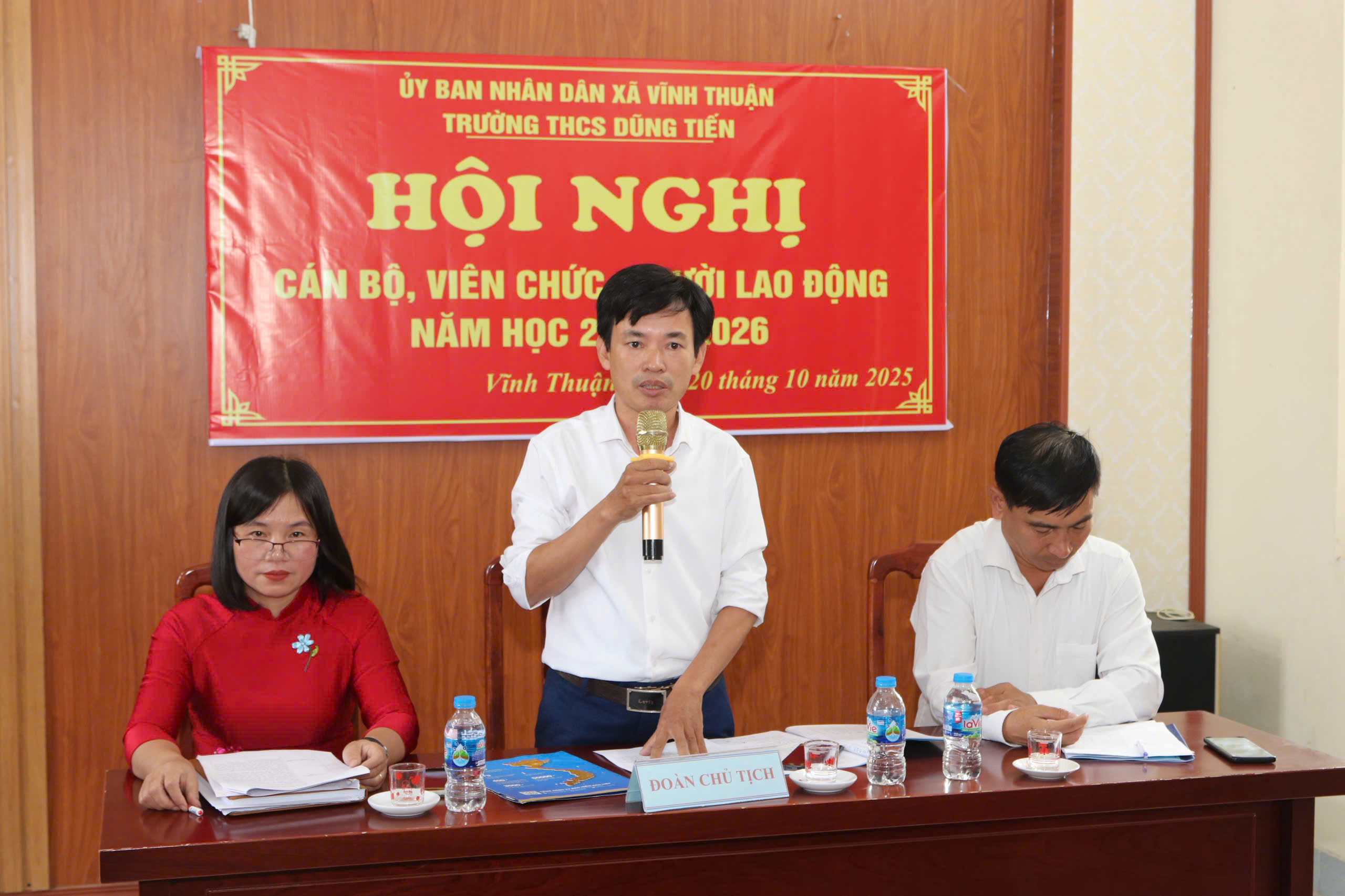 Đồng chí Đoàn Đức Giang, Chủ tịch MTTQ VN xã Vĩnh Thuân phát biểu chỉ đạo tại Hội nghịTrong năm học mới, nhà trường đề ra phương hướng trọng tâm là: nâng cao hiệu lực, hiệu quả quản lý; siết chặt kỷ cương, trách nhiệm của cán bộ, giáo viên; tăng cường ứng dụng công nghệ thông tin và chuyển đổi số trong giảng dạy, kiểm tra, đánh giá; tiếp tục đẩy mạnh phong trào thi đua “Dạy tốt – Học tốt”, xây dựng môi trường học tập thân thiện, học sinh tích cực.